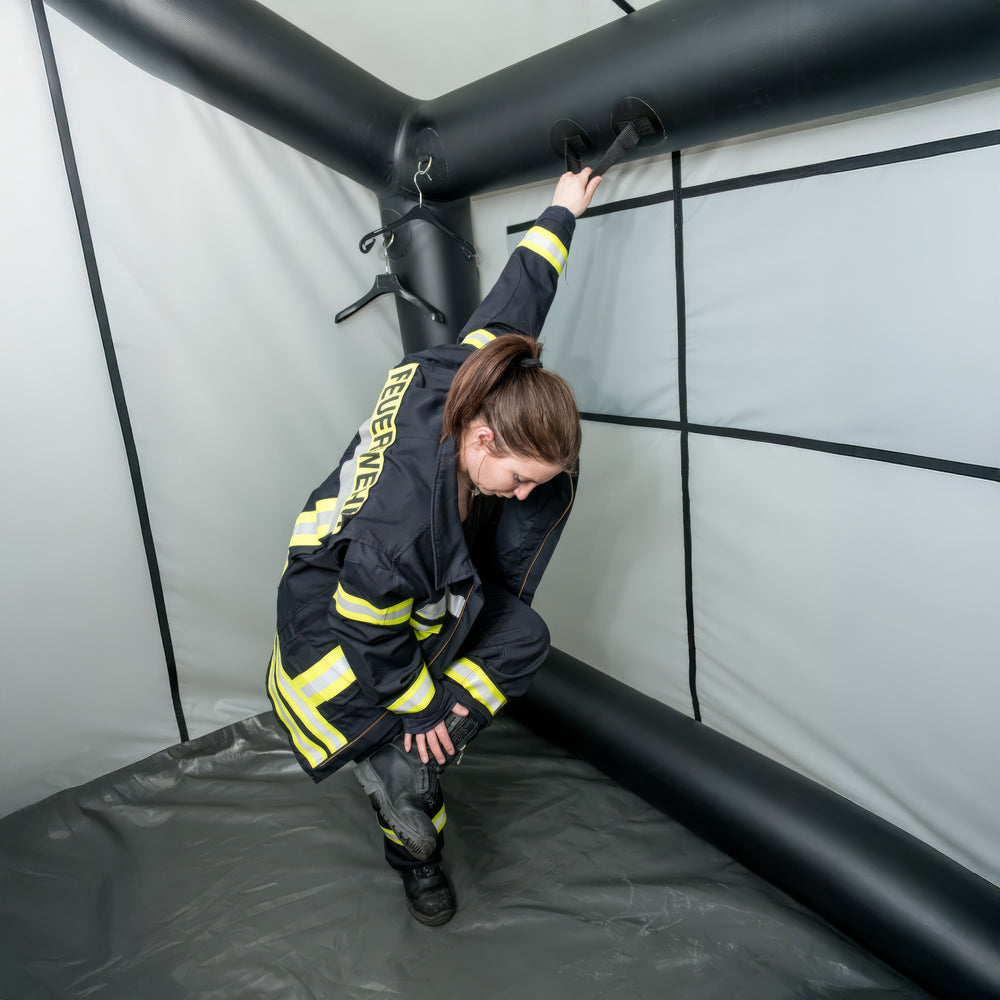 Das VETTER PSA 2 Zonen-Umkleidezelt ist ein aufblasbares Schnelleinsatzzelt mit Schwarz-Weiß-Trennung für truppweises Umkleiden direkt an der Einsatzstelle. In nur 40 Sekunden mit Druckluft aufgebaut, ermöglicht es das sichere Ablegen kontaminierter PSA nach Brandeinsätzen – gemäß den Empfehlungen der DGUV Information 205-035. Kompakte Maße 1,8 x 3,8 m (6,84 m²) – passt auf Gehsteig oder hinter Einsatzfahrzeug.